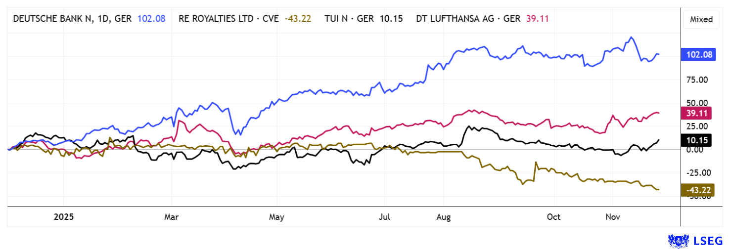 **Green finance is a welcome topic, but it remains underrepresented on the capital markets. RE Royalties is filling a crucial gap by generating recurring royalty income from renewable energy projects while offering investors predictable distributions - a niche model with significant potential for valuation increases. At the same time, Deutsche Bank is breaking new ground, and both Lufthansa and TUI are also making progress in their restructuring efforts.