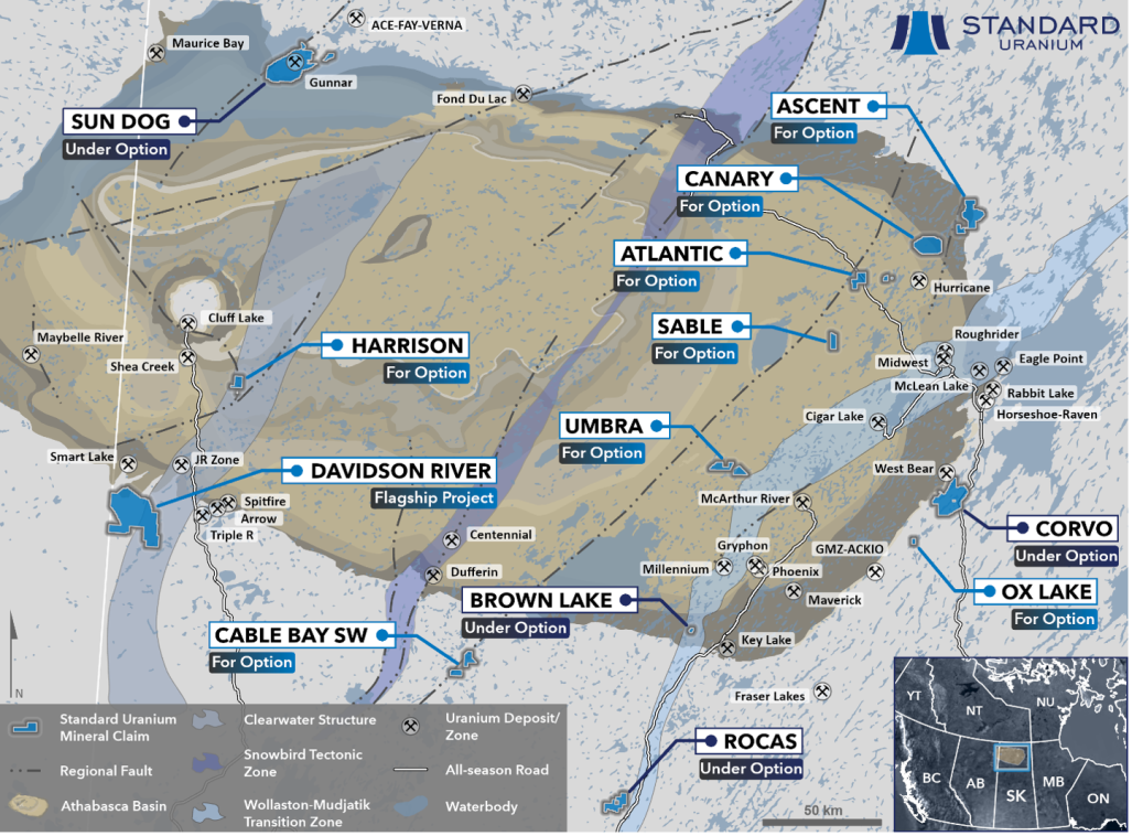 Standard Uranium's current portfolio comprises 13 high-quality uranium exploration projects in uranium-rich districts of the Athabasca Basin. Its portfolio spans 57 claims over more than 95,000 hectares. The flagship project is Davidson River, while the latest addition, the Harrison project, lies in the southwest of the Athabasca Basin - near Fission Uranium's Triple R deposit and NexGen Energy's Arrow project. F3 Uranium has recently reported high-grade discoveries in the same area.