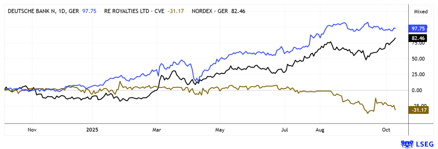Volatility on the stock markets has remained extremely high for months. However, the markets have recovered impressively from Trump's tariff shock in April and are once again hitting new highs. Even sustainable investments such as Nordex have now gained over 70% in 12 months. The operational turnaround at Deutsche Bank has resulted in a 90% increase in value. Meanwhile, RE Royalities is currently consolidating at around CAD 0.35, but maintains promising prospects.