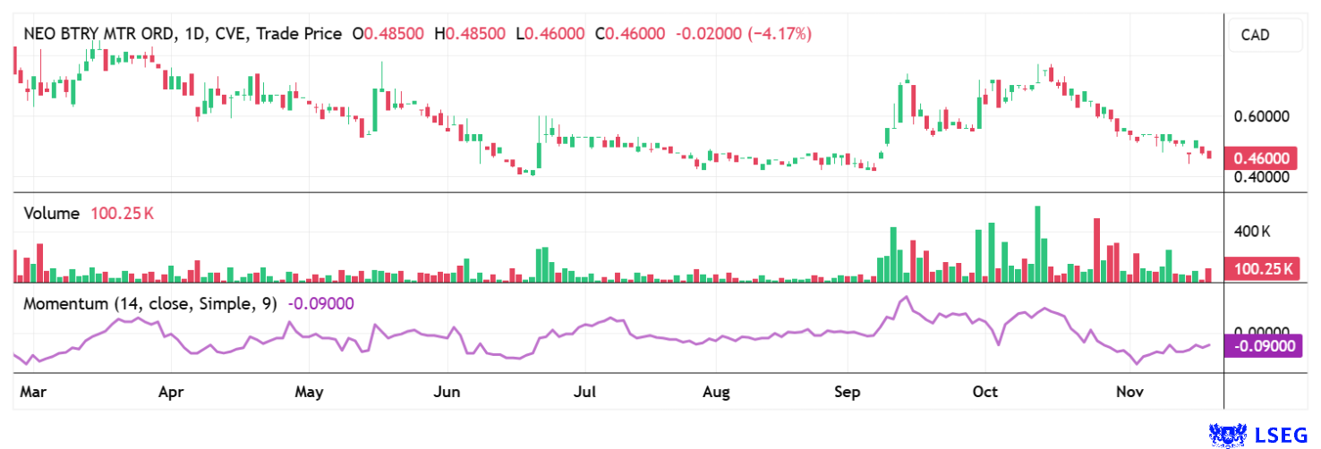 NEO Battery is currently performing strongly and is attracting new investors. The CAD 5 million private placement completed in November 2025 significantly strengthens the capital base. The funds are to be used to finance new battery production facilities for cylindrical and prismatic cell formats. In addition, equipment and infrastructure for the 3.2-acre expansion site will be procured. Overall, the combination of technological strength, a growing production base, new industry partnerships, and solid financing creates the ideal conditions for the next growth spurt. The stock can be purchased in Canada under the ticker symbol NBM for approximately CAD 0.47 or at a low cost on Tradegate. The Company is showing strong momentum, so the current valuation of CAD 68 million is certainly only a starting point for its next stages of growth.