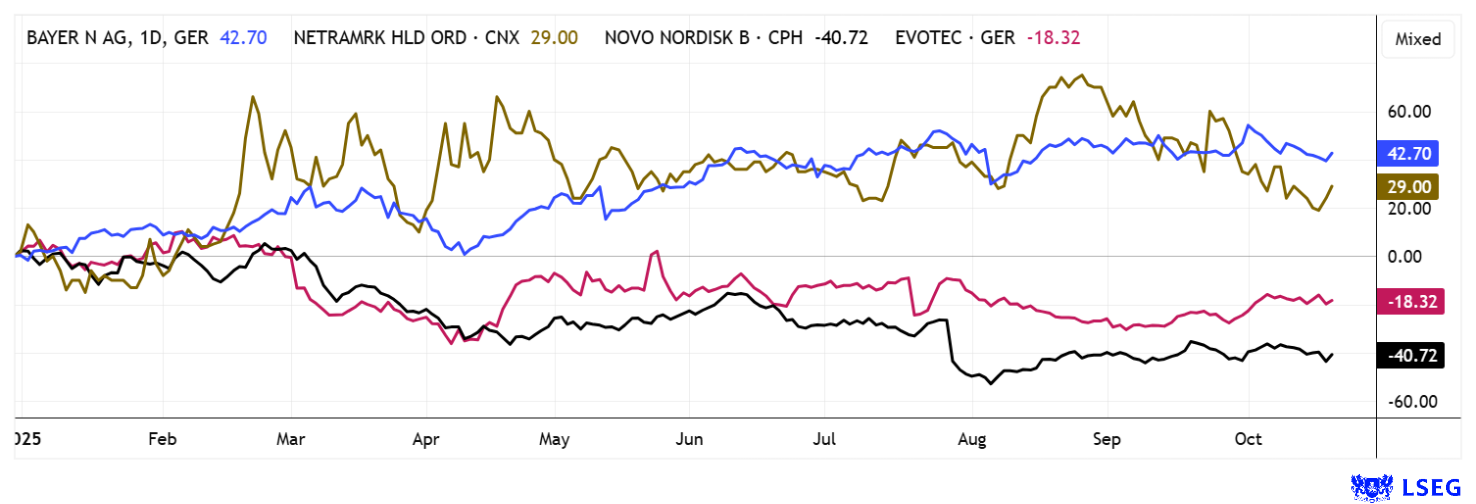 Artificial intelligence is establishing itself as a key factor in medical progress, from drug discovery to patient communication. NetraMark impresses with data-based models that identify disease patterns more quickly and optimize clinical processes. Evotec uses AI to deepen partnerships with pharmaceutical giants and expand its pipeline of precision therapeutics. Bayer is relying on digital platforms to streamline research and approval processes, which could leverage efficiency potential. Novo Nordisk remains a heavyweight in the obesity segment, and after a temporary 70% correction, the prospect of a turnaround is now attracting interest.