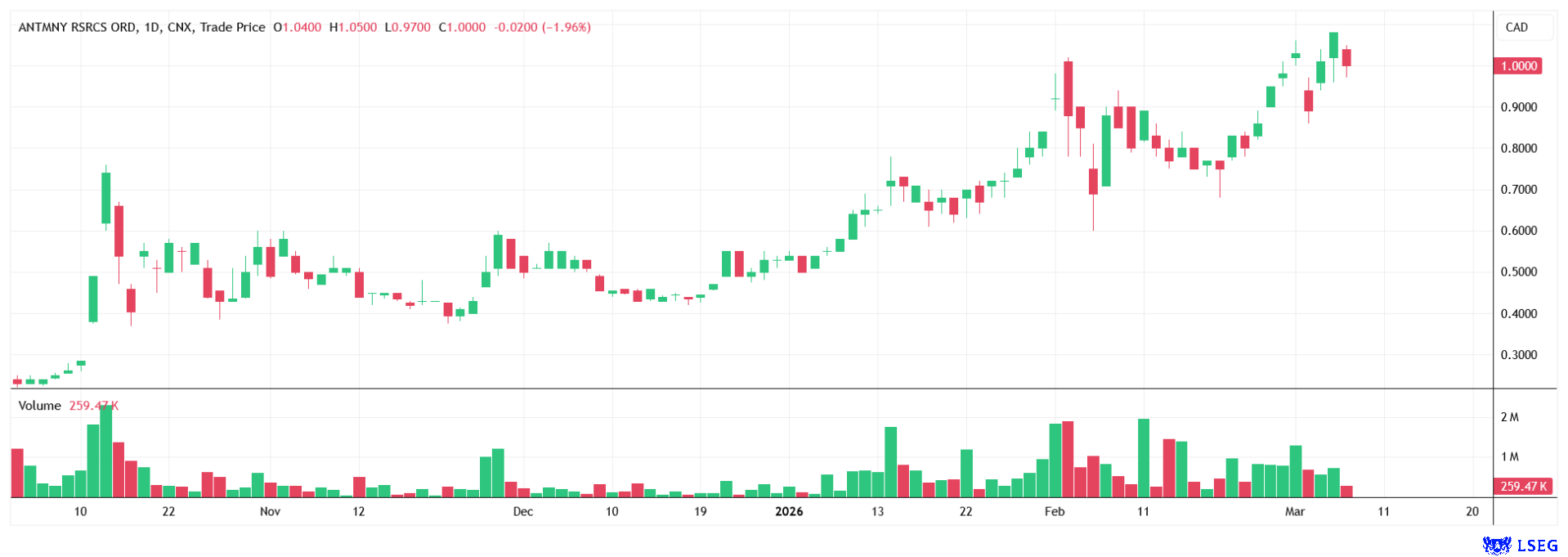 The Antimony Resources chart looks exemplary. The share price runs almost like a string from the bottom left to the top right. In 2026, the value doubled from CAD 0.50 to CAD 1.00. This shows how sought-after and coveted companies in the antimony sector are, especially Antimony Resources. Also noteworthy is the increased trading volume in 2026, which indicates increased buying interest, including from institutional investors. Since antimony deposits are important for the defense and energy industries, certain resources could become geopolitically important for certain countries, so it cannot be ruled out that governments themselves will take strategic action here, participate, or seek to secure the deposits. Even after the recent doubling of the share price, it cannot be ruled out that the price will double again. Here, the only limit is the sky.