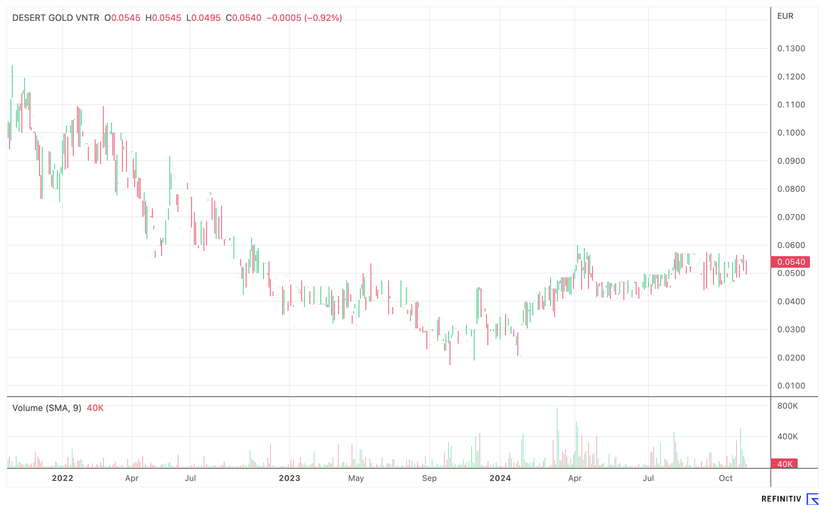 On its home exchange in Toronto, Desert Gold shares were recently trading at CAD 0.08. While trading volume has increased in recent weeks, the stock still appears to be in a phase of relative undiscovered potential. However, this low valuation may soon be a thing of the past. The stock is also tradable in Germany, making it easily accessible for investors.