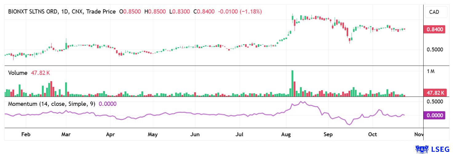 BioNxt Solutions is on the verge of an important milestone in the development of a novel sublingual MS therapy. The upcoming human bioequivalence study in 2026 will show whether the technology has the potential to change existing treatment paradigms. At the same time, the Company is strengthening its scientific and commercial base with its broad patent strategy and additional drug platforms. With the latest financing, the coffers are full for further steps through 2026. After a brief correction in October, the share price picked up speed again and climbed to CAD 0.85. This brings the 115.76 million shares to a market value of CAD 98.4 million - far too cheap for a biotech platform with this level of momentum!