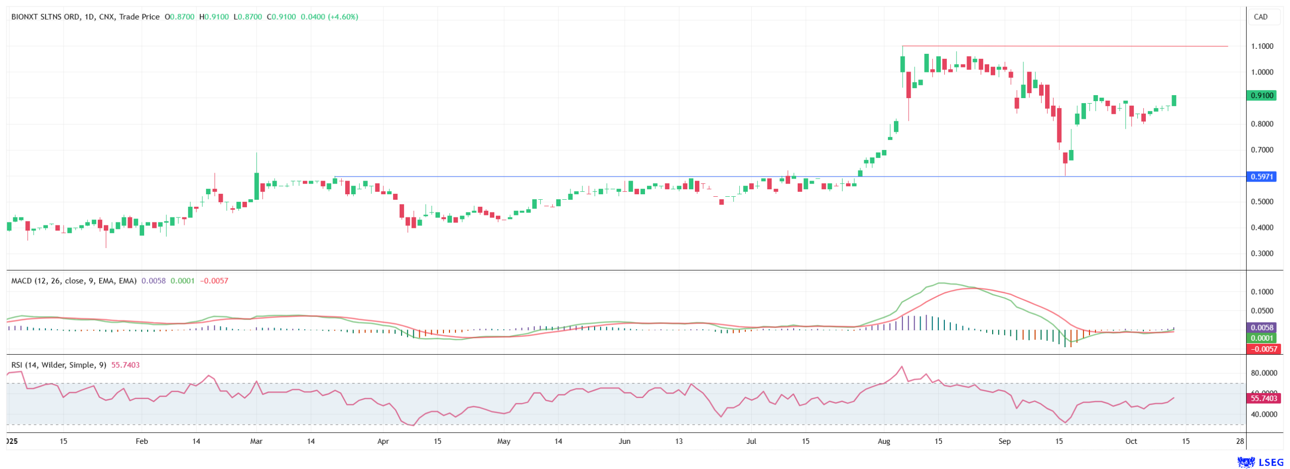 Even the emotional post by the energetic US president could not halt the positive development of BioNxt shares. With a closing price of CAD 0.91 on Friday, up 4.6%, the share price is heading towards its all-time high of CAD 1.10. After a correction in mid-September, the share price was able to hold its striking support zone at CAD 0.60 and began a counter-movement amid rising volume. The technical indicators suggest this could be just the beginning. The MACD trend follower generated a buy signal near the zero line last week, while the RSI stands at a moderate 55.74 points and is still far from the overbought range.