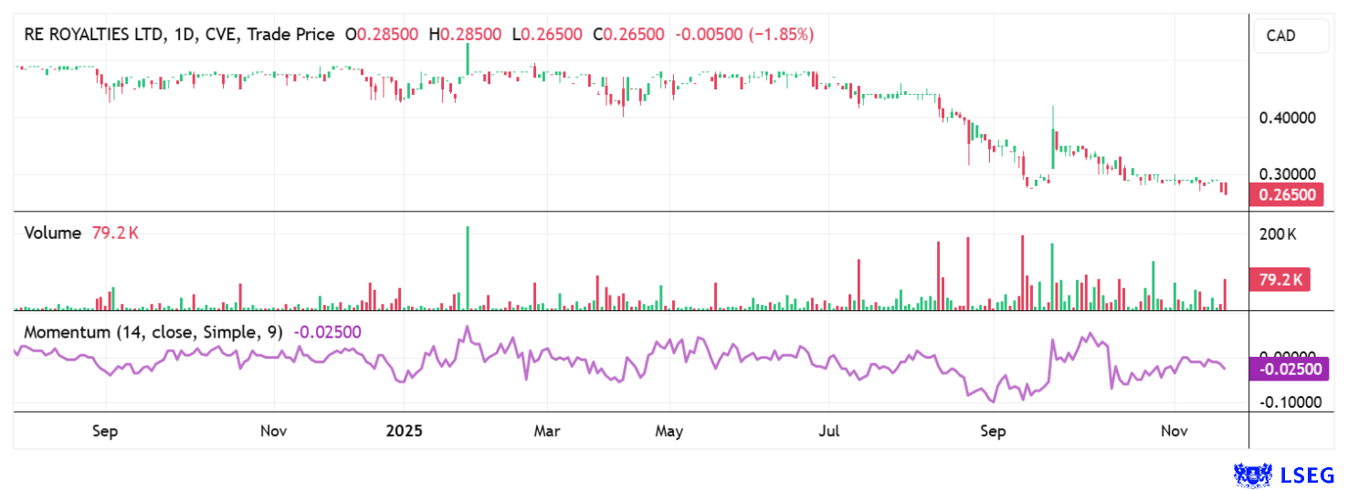 For investors, RE Royalties offers an attractive dividend yield of currently around 14%, based on quarterly distributions of CAD 0.01 per share and a current share price of around CAD 0.27, in addition to its innovative FinTech presence. This yield is exceptionally high in the renewable energy sector and results from long-term power purchase agreements with terms of 20 to 40 years. In addition, the Company has issued CAD 6.2 million in green bonds in 2024, the proceeds of which will be used exclusively to finance sustainable projects in accordance with international standards. RE Royalties thus combines financial strength with environmental and social responsibility. Investors receive a "green mix" with character and, on top of that, decent distributions. The current share price of CAD 0.27 is attractive for new investments or additions for risk-conscious investors.