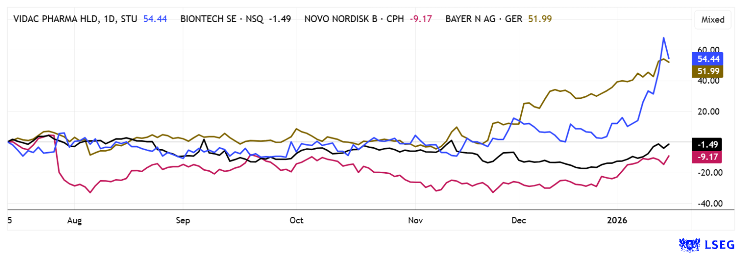 After a prolonged consolidation phase, the biotech sector is on the move again. In recent weeks, stocks such as Bayer, BioNTech, and Novo Nordisk have defended important technical support zones and subsequently risen sharply. With the start of the 2026 stock market year, capital is now likely to be increasingly shifted from well-performing technology stocks to attractively valued life science and biotech companies. Among these promising stocks, Vidac Pharma is also increasingly coming into focus. The Company, which is working on novel therapeutic approaches in the fields of oncology and dermatology, is benefiting from the positive sentiment in the sector and its own strong momentum.