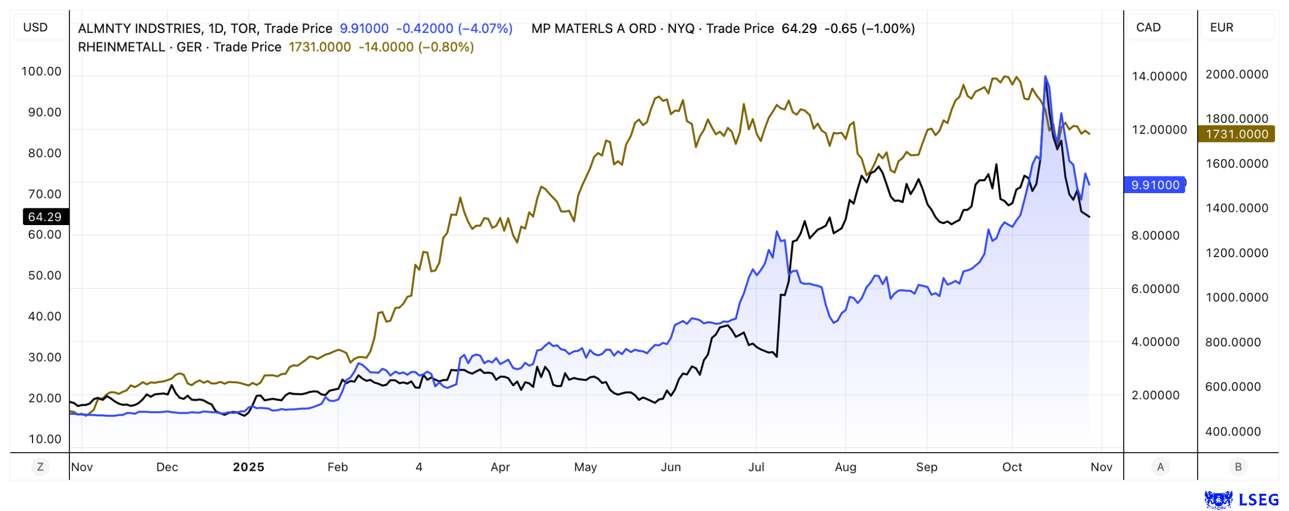 RHEINMETALL AG | DE0007030009													,							ALMONTY INDUSTRIES INC. | CA0203987072													,							MP MATERIALS CORP | US5533681012