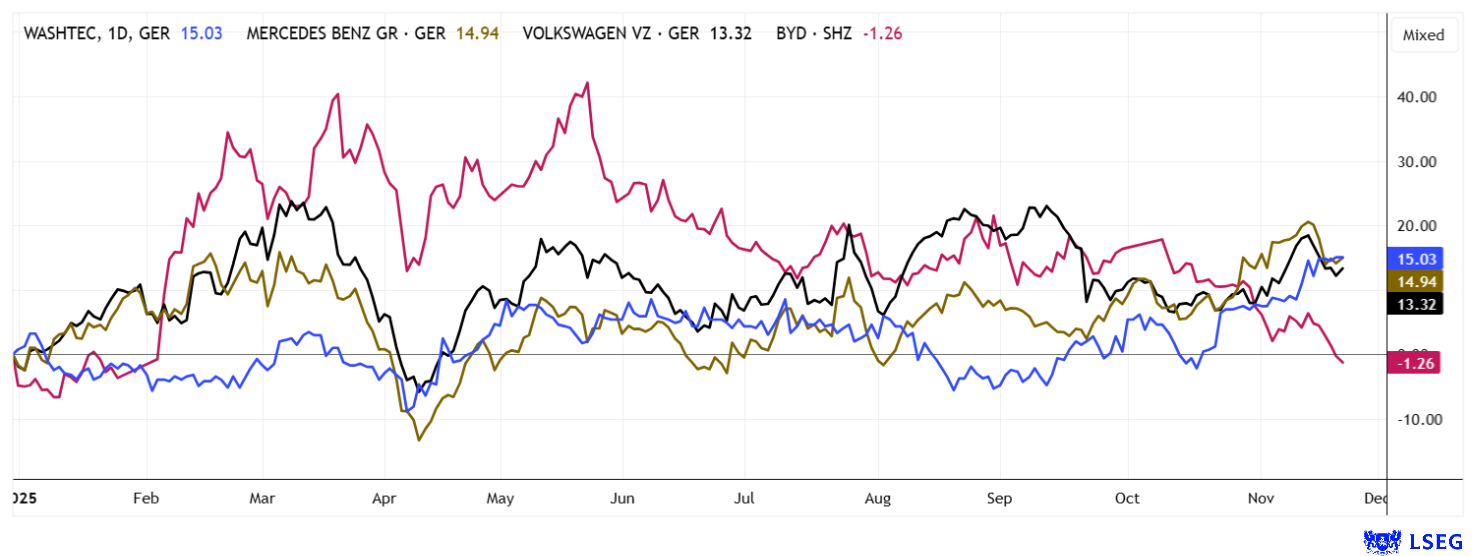 WASHTEC AG O.N. | DE0007507501 , MERCEDES-BENZ GROUP AG | DE0007100000 , BYD CO. LTD H YC 1 | CNE100000296 , VOLKSWAGEN AG VZO O.N. | DE0007664039