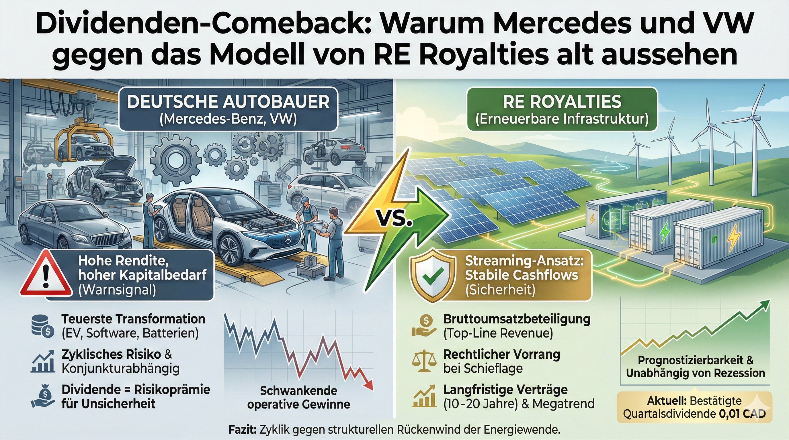 In a market phase in which interest rates have peaked, and tech stocks are ambitiously valued, investors are once again turning their attention to the oldest source of income in stock market history: dividends. But the hunt for the highest returns often turns out to be a dangerous undertaking, because a high percentage payout is usually not a sign of strength, but a warning signal for falling prices or structural problems. While German automotive giants Mercedes-Benz and Volkswagen attract investors with seemingly favorable valuations and generous returns, their business model is facing the most expensive transformation in history. In this environment, RE Royalties, a Canadian niche stock, is coming into focus. Its business model is specifically designed to generate stable cash flows from the megatrend of the energy transition without bearing the operational risks of an industrial group.