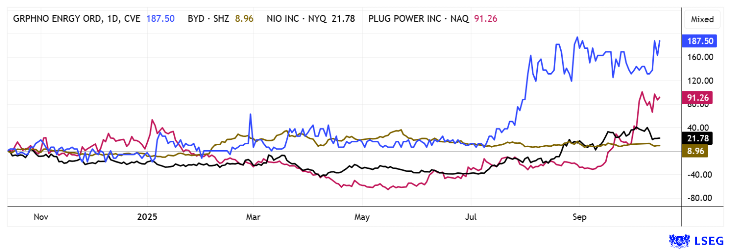 BYD CO. LTD H YC 1 | CNE100000296 , NIO INC.A S.ADR DL-_00025 | US62914V1061 , Graphano Energy Ltd. | CA38867G2053 , PLUG POWER INC. DL-_01 | US72919P2020