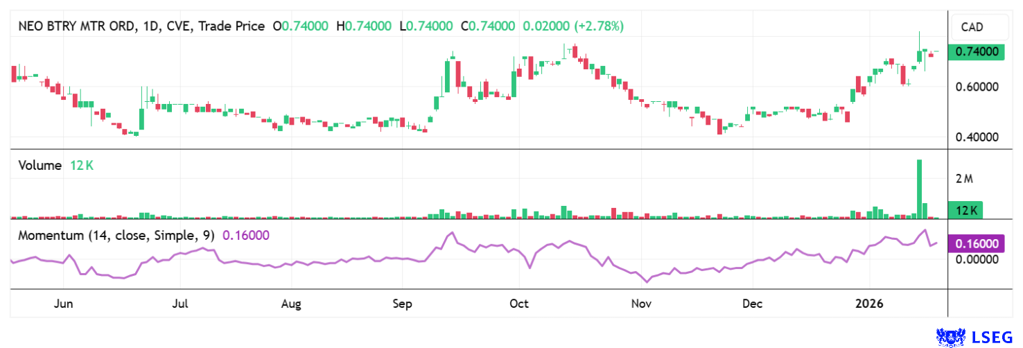 The combination of in-house material development and increasing vertical integration across different cell formats remains a long-term differentiating factor. This integration gives NEO Battery a clear competitive advantage, particularly in weight-sensitive niche applications. To finance further expansion, the Company completed a fully placed capital increase of approximately CAD 7 million at the beginning of 2026. The funds will primarily be used for additional production facilities and the expansion of cell formats, laying the foundation for rising revenue in the medium term. Given the recent dynamic development, the current market capitalization of CAD 106 million marks the starting point for significantly higher valuation levels. Technically, a continuation of the breakout above CAD 0.80 would be a strong buy signal.