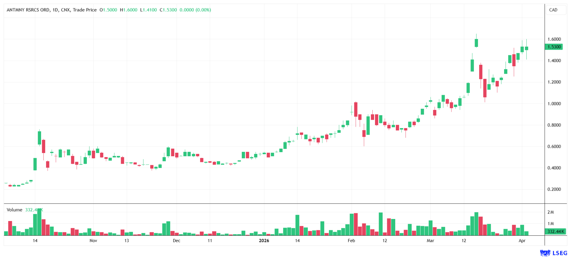 The stock is currently trading at CAD 1.53.