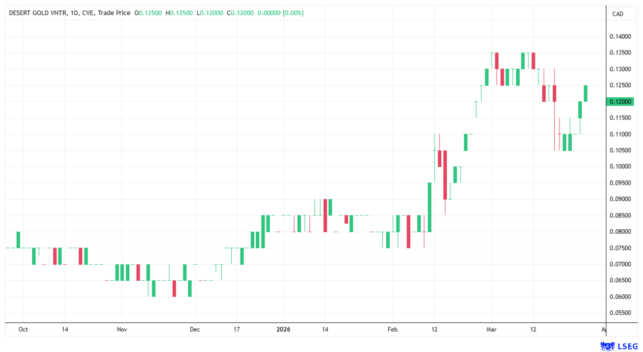 Management plans to construct a low-cost heap leach plant for the Barani East and Gourbassi West zones, initially targeting an annual production of 30,000 to 40,000 ounces. Research firm GBC Research has initiated coverage of the company with a clear "Buy" recommendation. Analysts emphasize the significant upside potential of the gold in the ground and set a price target of CAD 0.26. At current prices of around CAD 0.07, this corresponds to a theoretical return potential of over 270%. Investors see a setup with Desert Gold's stock where the ongoing gold boom meets an imminent start of production in a region overlooked by the market. Risk-aware investors should stay on top of Desert Gold and definitely keep the stock on their watchlist.