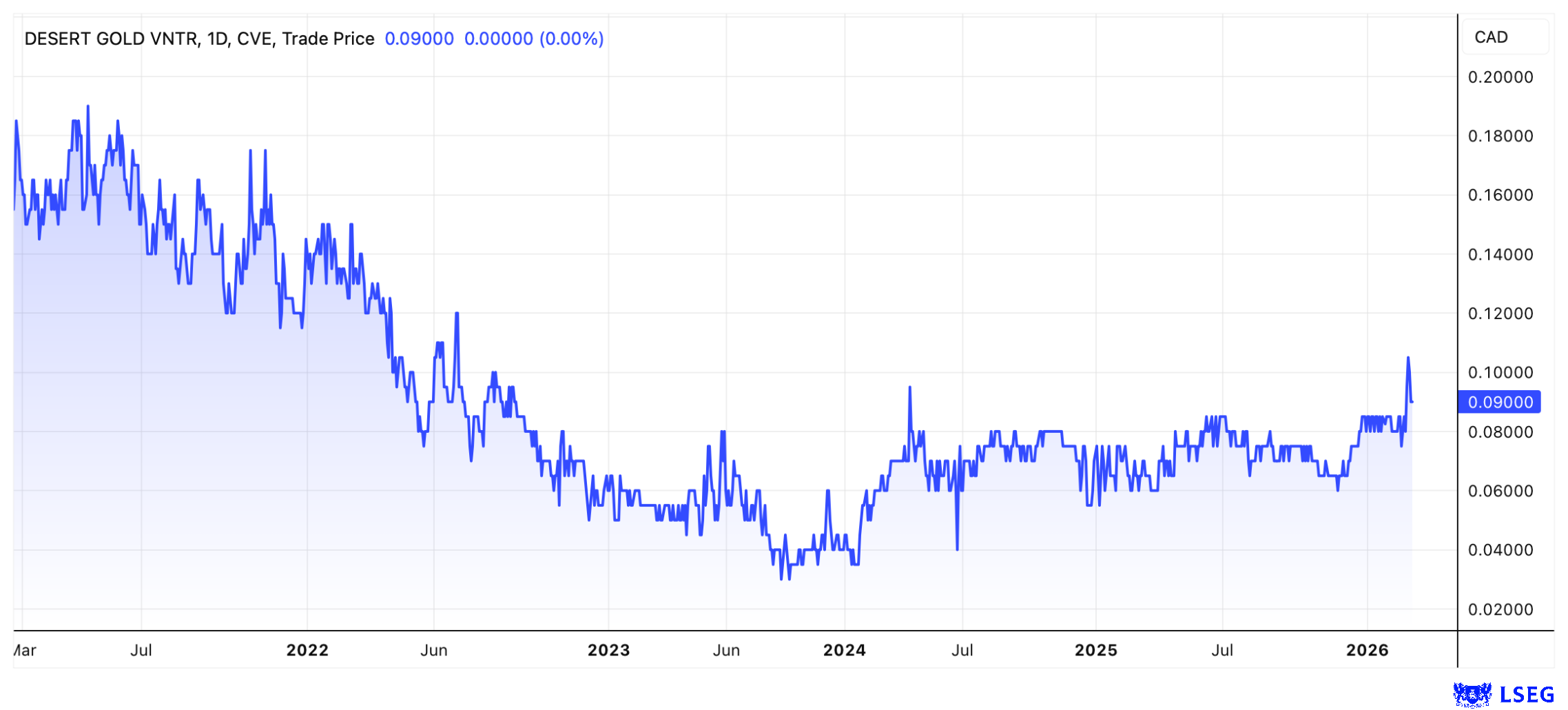 Even at a gold price of USD 3,000 per ounce, the project's internal rate of return (IRR) is 57%. The net present value (NPV 10%) after taxes is over USD 61 million. The current value is therefore likely to be significantly higher. And as mentioned, the PEA only covers part of SMSZ. It is therefore not surprising that analysts at GBC Research see the fair value of Desert Gold shares at CAD 0.43 and recommend buying the stock. The security is currently trading at CAD 0.09.