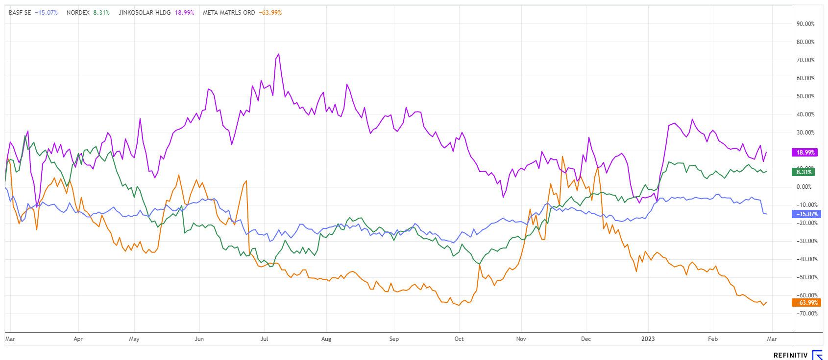 Two well-known representatives of the "alternative energy" sector are wind turbine manufacturer Nordex and solar panel expert JinkoSolar. While Nordex is still down 4% on a 12-month view after several profit warnings and despite a steep recovery rally, JinkoSolar has lost 40% since mid-2022 after a rollercoaster ride but can still boast a share price gain of 11% due to the outstanding order situation.
