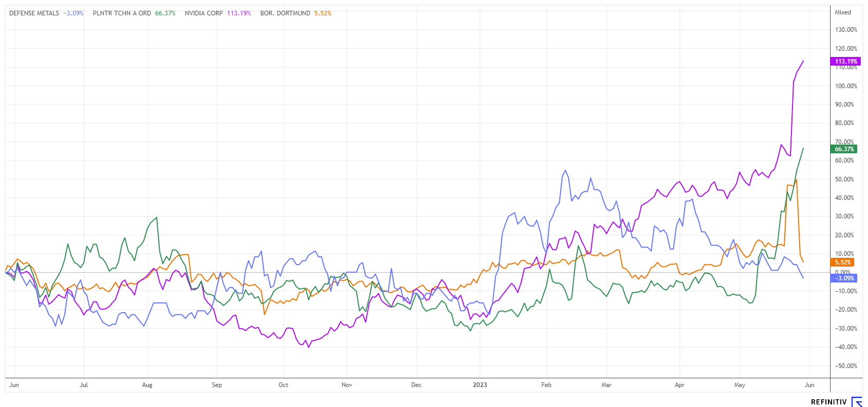 Data is as much in demand these days as strategic metals. Those who want to be at the forefront of the high-tech or Greentech industry need both: access to raw materials and the necessary information about trends in legislation and public opinion. Artificial intelligence can help, but in certain situations, it will also fail. Palantir has run wide, Borussia Dortmund is back down to earth, and Defense Metals remains a top pick for the Strategic Metals sector.