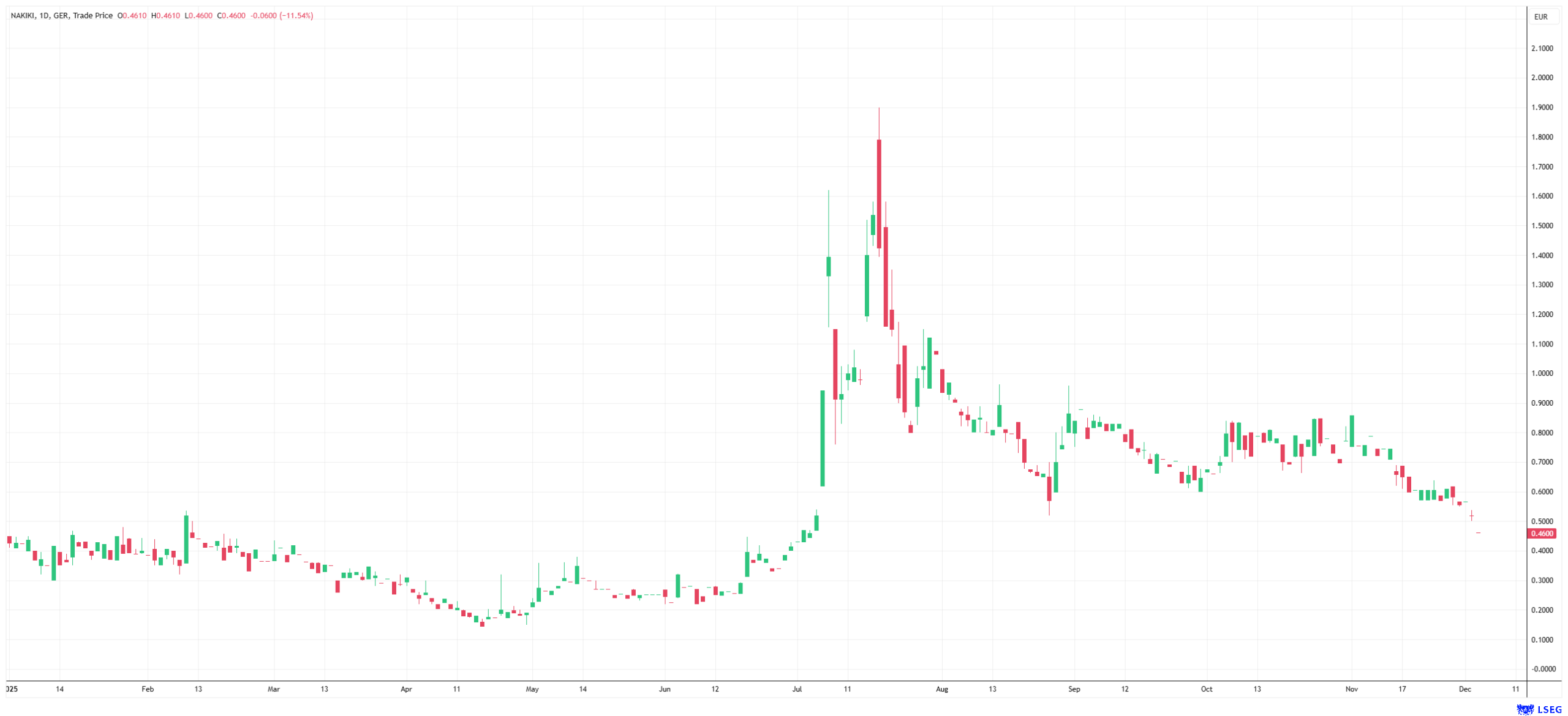 Nakiki is currently an absolute micro-cap on the stock market and has a market capitalization of only around EUR 4 million. Recently, the Bitcoin treasurer, who wants to buy the cryptocurrency tactically and smartly, suffered from the sell-off of Bitcoin. Nakiki's risk/reward profile is, of course, completely different from that of Bank of America or Commerzbank. However, Nakiki should benefit from its agility and the experience of CEO Andreas Wegerich, who is considered a bond expert in the German small-cap scene and has already accompanied transactions with a total value of more than EUR 1 billion. If Bitcoin rises again and the Nakiki team shows a lucky hand in buying the cryptocurrency, the stock is also likely to pick up speed again. Added to this is the speculation surrounding possible investments that the Company has initiated in recent months.