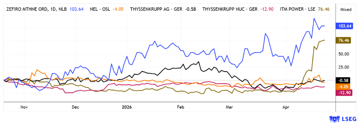 The capital markets currently present a different scenario every day. In the short term, hope flares up that the conflict in the Middle East might soon be over, only to be immediately followed by the next escalation. In some areas, the current doubts about fossil fuels are actually spurring growth in the alternative energy sector. Hydrogen and the methane sector, in particular, are benefiting from this environment. While ITM Power and Zefiro Methane are making headway here, caution is still advised with thyssenkrupp nucera and Nel ASA.