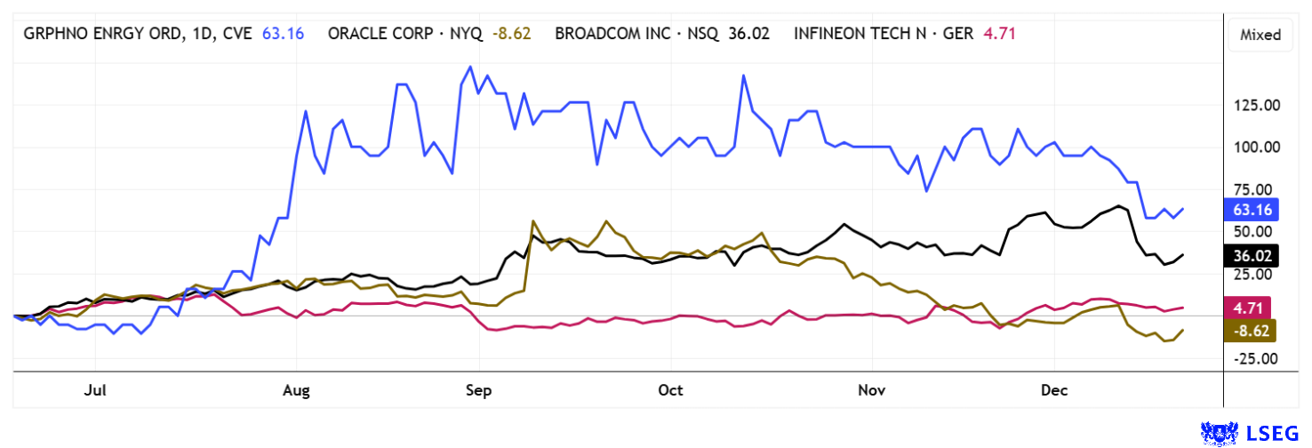 New year, new luck! Assuming that the losers of 2025 could become the winners of 2026, Oracle does not look too expensive with a 2026 P/E ratio of 26. Infineon even has a profit ratio of only 22, while Broadcom takes the cake with 34. Explorer Graphano Energy also appears attractive – on the one hand because of its interesting strategic positioning in the critical raw materials sector, and on the other because of its still negligible total value of less than CAD 5 million. Exciting!
