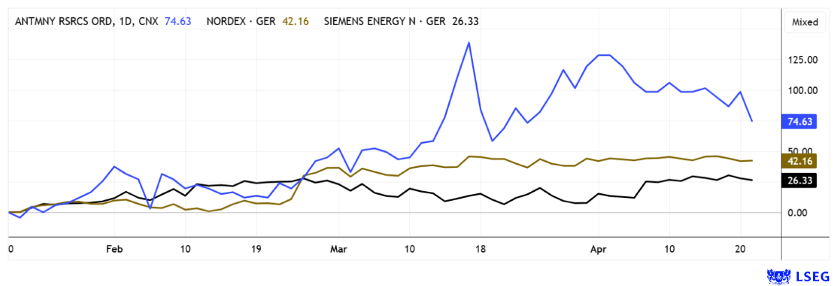 Investors have faced challenging times. Global markets remain marked by significant volatility, as the decisions and statements of US President Donald Trump continue to exert a major influence on global events. Like many other raw materials, antimony is also considered a key metal for the high-tech and defense industries. If the Strait of Hormuz is not restored to unrestricted passage in the near future, serious production disruptions could arise in parts of the Western economy. In such an environment, Antimony Resources is likely to attract increased investor interest, as the company is viewed as a future building block for stabilizing Western supply chains. For Nordex and Siemens Energy, the next quarterly results will have to show whether the strong price gains are justified in the medium term.