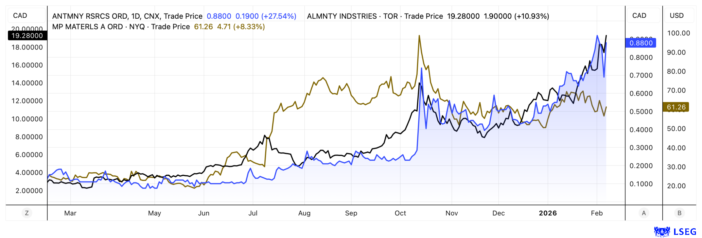ANTIMONY RESOURCES CORP | CA0369271014 , MP MATERIALS CORP | US5533681012 , ALMONTY INDUSTRIES INC. | CA0203987072