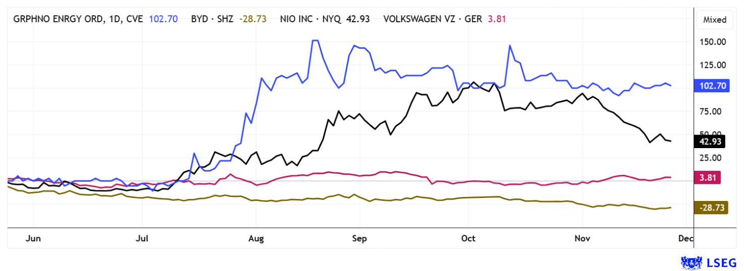 BYD CO. LTD H YC 1 | CNE100000296 , NIO INC.A S.ADR DL-_00025 | US62914V1061 , Graphano Energy Ltd. | CA38867G2053 , VOLKSWAGEN AG VZO O.N. | DE0007664039