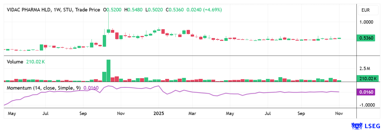 Vidac Pharma is in a phase of increasing visibility and plans to list its shares on the primary market of the Düsseldorf Stock Exchange in order to increase trading liquidity and, in the future, enable access to XETRA trading. Despite its currently low market capitalization, the depth of its pipeline and ongoing scientific validation reflect a clear valuation delta that points to significant development potential. A multiplier candidate for 2026!