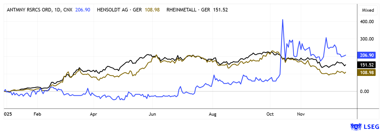 Increasing geopolitical turmoil has made security and control over critical raw materials a central factor in modern investment strategies. At the same time, the possibility of peace hangs over traditional defense stocks like the Sword of Damocles, as signs of détente could lead to devaluations at any time. Antimony Resources is benefiting from the growing importance of strategic metals, which are indispensable for both defense and high-tech products. Dynamic investors should aim for broad diversification across the entire security and commodity complex and always keep an eye on their stops.