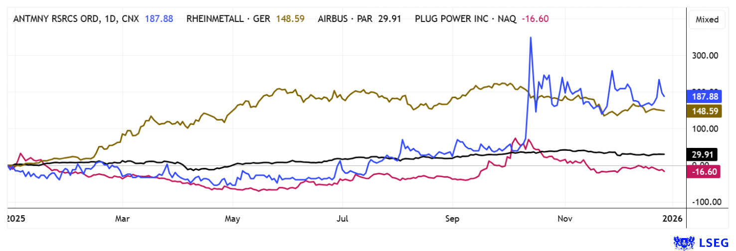 No peace in Ukraine after all? Defense stocks are being passed around like hot potatoes; no one seems to want to be invested when the flag of peace is raised. Yesterday, the defense sector fell by 4% at times, with Rheinmetall even dropping below the EUR 1,500 mark. When disappointing interviews with Donald Trump arrived from Florida, the stocks turned upward again. The fact remains that the defense sector needs critical metals. Industrial giant Airbus has secured several new orders, while Plug Power's targets are being pushed further and further back. Is another capital increase looming? Antimony Resources remains promising, as the Canadians have what Donald Trump would like to have. Judge for yourself!