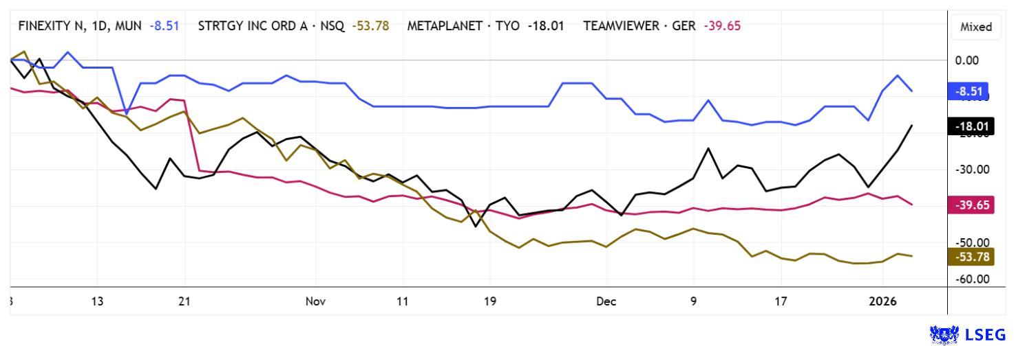 Metaplanet pursues a similar Bitcoin-centric model, but also relies on yield strategies with options to generate ongoing revenue. The Japanese company increased its BTC holdings by 4,279 to 35,202 by the end of 2025, while reporting a sharp rise in revenues from its Bitcoin derivatives business. This cash flow component on an option writer basis is intended to cushion volatility and make Metaplanet less dependent on market cycles. Nevertheless, the share price temporarily slipped below the calculated value of its Bitcoin holdings. In recent days, however, sentiment has improved markedly, with the stock rebounding from around EUR 2.2 to EUR 2.8. Metaplanet remains tightly correlated with Bitcoin, with the added caveat that the stock does not trade on weekends. Highly speculative, but intriguing for risk-tolerant investors.