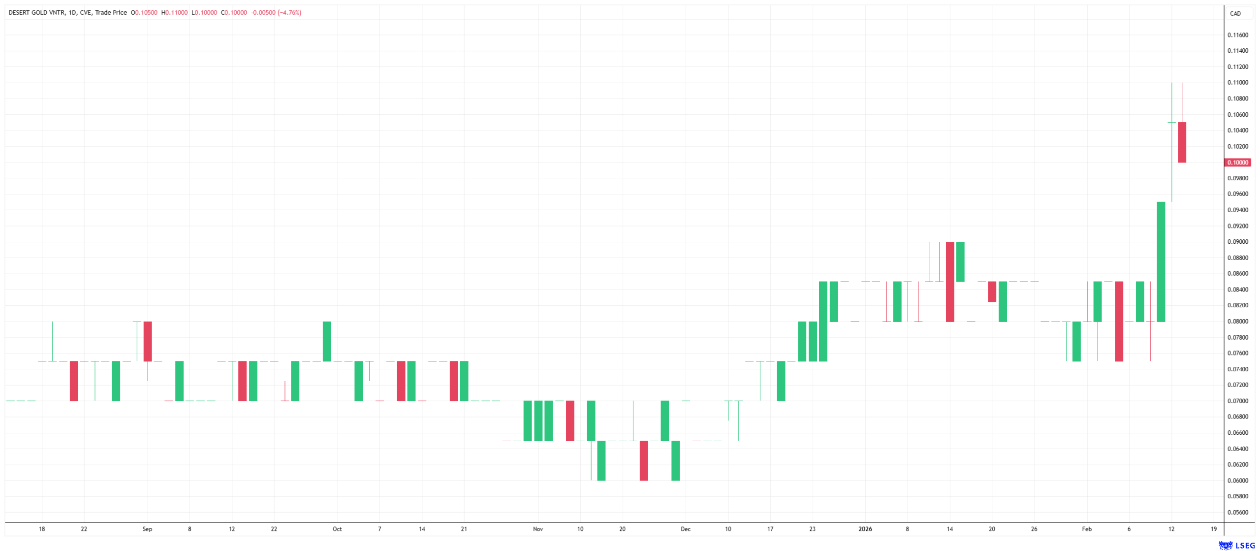 The message from Mining Indaba 2026 was clear: whoever has the resources makes the rules. Desert Gold Ventures owns the strategic reserve in West Africa's most important gold region. While Robex goes its own way and B2Gold looks for fodder for its mills, Desert Gold becomes an indispensable variable in the equation. The company offers investors an attractive starting position. Its valuation of just over CAD 30 million currently hardly reflects the value of its resources, let alone the strategic premium paid for secure assets in a transactional world. Whether Desert Gold goes into production itself and takes advantage of high gold prices or is swallowed up by one of its neighbors is almost irrelevant to investors: the stock is undervalued amid the gold boom and is likely to be the focus of several major players. Those who can take on the country risk in Mali will find a promising opportunity here – the conditions for a revaluation appear to be in place.