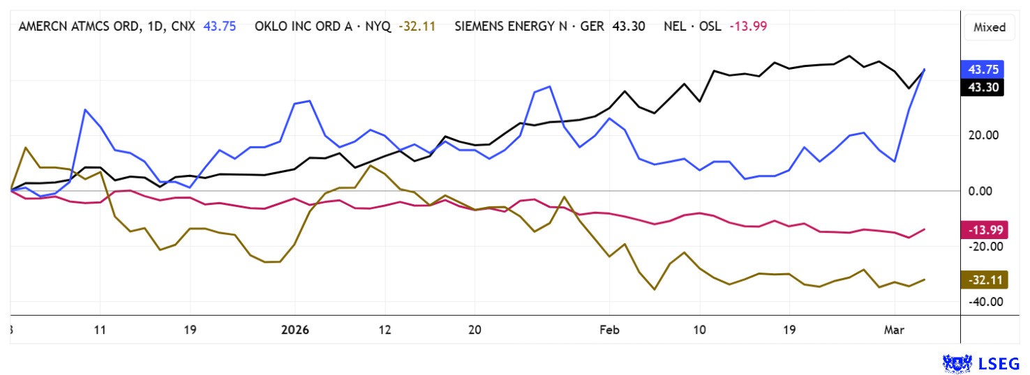 Energy markets have been in turmoil since the start of the war in Iran. This is hardly surprising, given that Iran's exports amounted to 5 million barrels of oil per day in the best of times. Now, however, the Strait of Hormuz is also under threat, which is driving up prices. This presents both opportunities and risks for investors. While oil multinationals are making strong gains, alternative energy companies are also coming back into focus. Siemens Energy has already performed well, and now Nel ASA and SMR specialist Oklo are following suit. American Atomics deserves particular attention, as it is establishing a closed supply chain for uranium and a new Western nuclear industry. Very exciting!